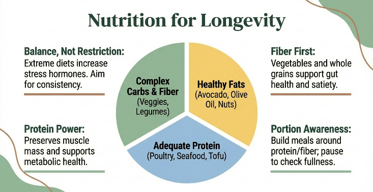 Chronic stress affects eating patterns, cravings, and metabolic efficiency. Managing stress through mindfulness, movement, or therapy can reduce emotional eating and support hormonal balance.